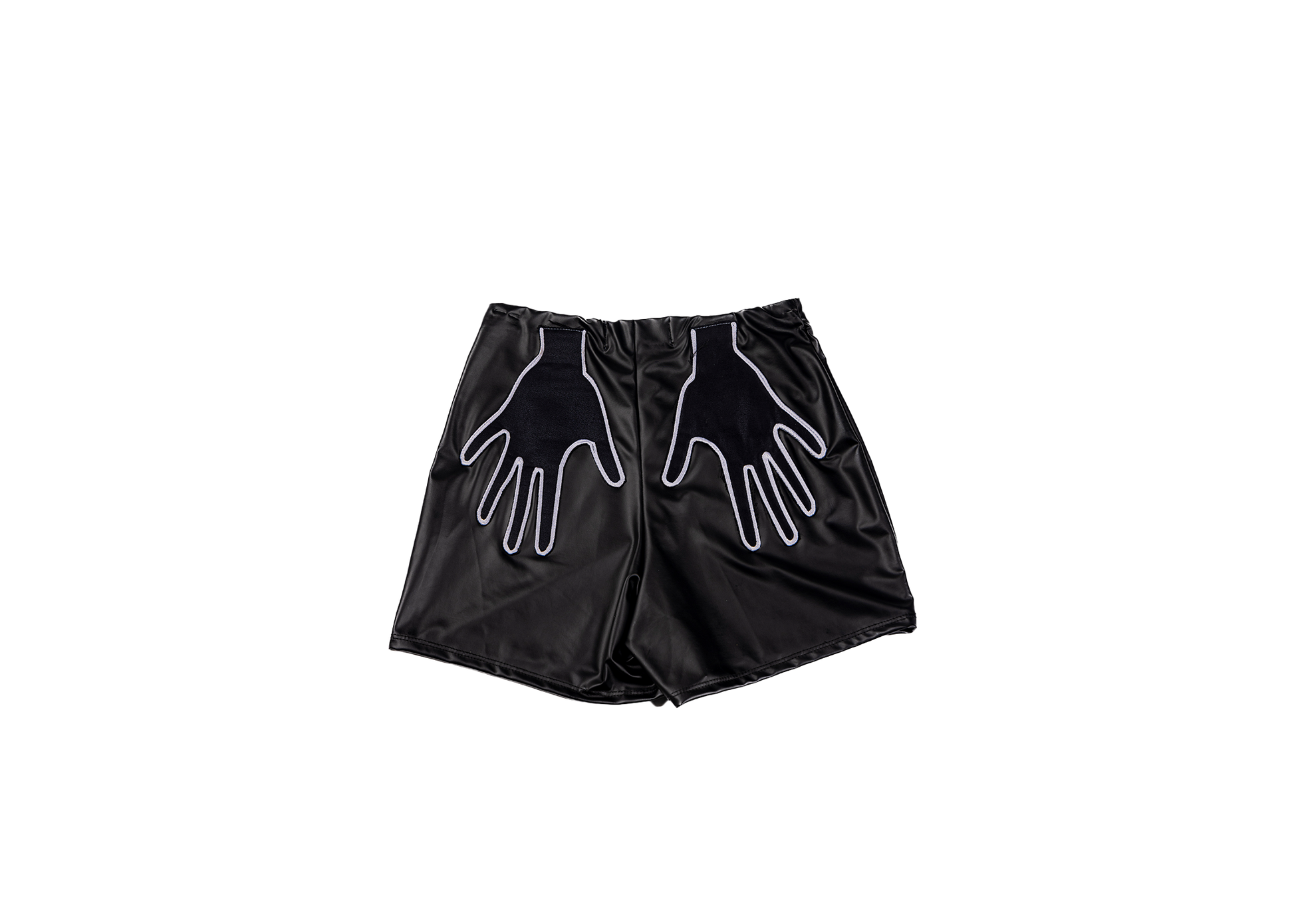 A touch of style crowned bt the Ron Will hands. Women’s black pu leather shorts with elastic waistband and signature Ron Will hands on the back.