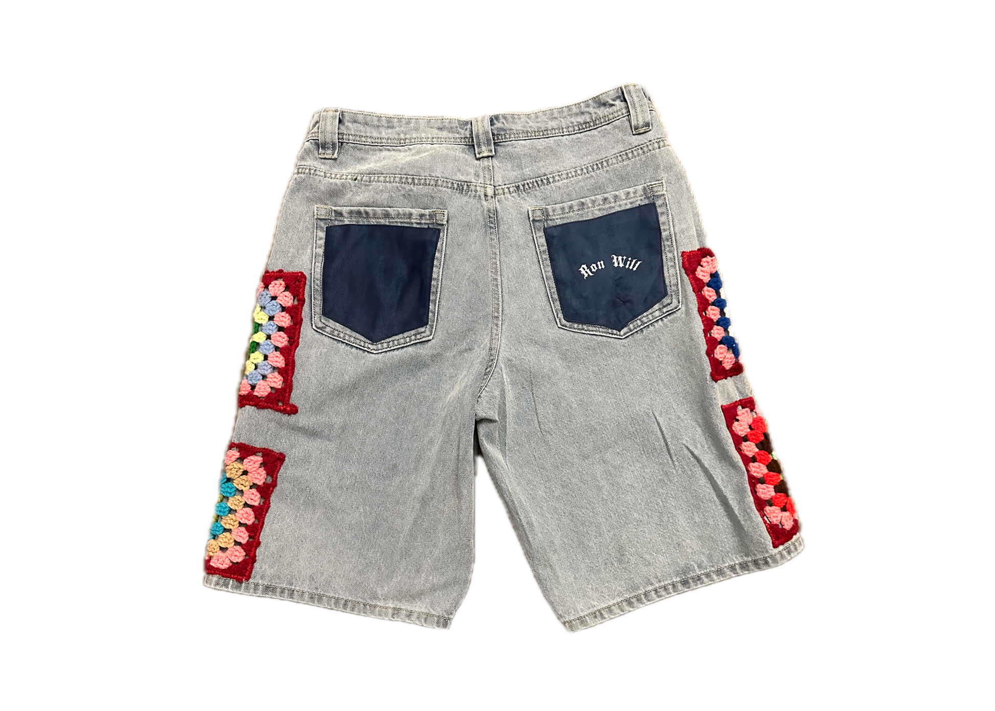 The Granny Square adds a element to Ron Will that reflects the 70s era. Ron Will created the Granny Square denim shorts baggy fit denim with granny squares down the sode seam with suede denim pocket on the back.